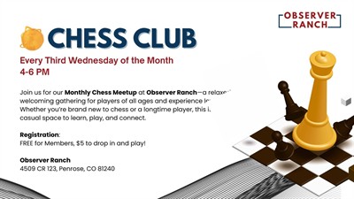 Join us for ourMonthly Chess Meetup at Observer Ranch—a relaxed, welcoming gathering for players of all ages and experience levels. Whether you’re brand new to chess or a longtime player, this is a casual space to learn, play, and connect.