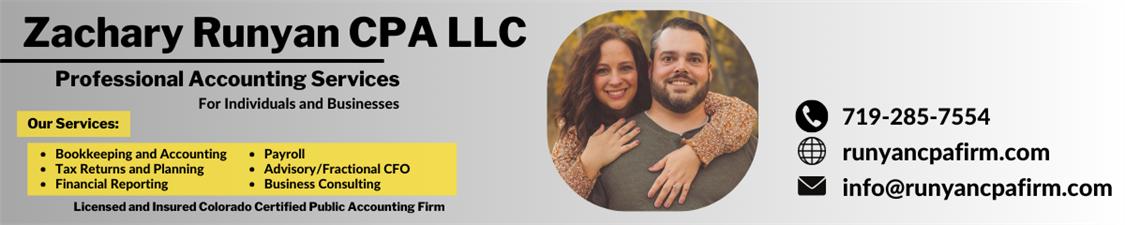 Zachary Runyan CPA LLC is a virtual CPA firm based in Cañon City, Colorado, providing comprehensive accounting, advisory, and tax services to individuals, businesses, and nonprofits. With a client-first approach, the firm specializes in tax preparation and planning, bookkeeping, payroll processing, business consulting, and fractional CFO services.